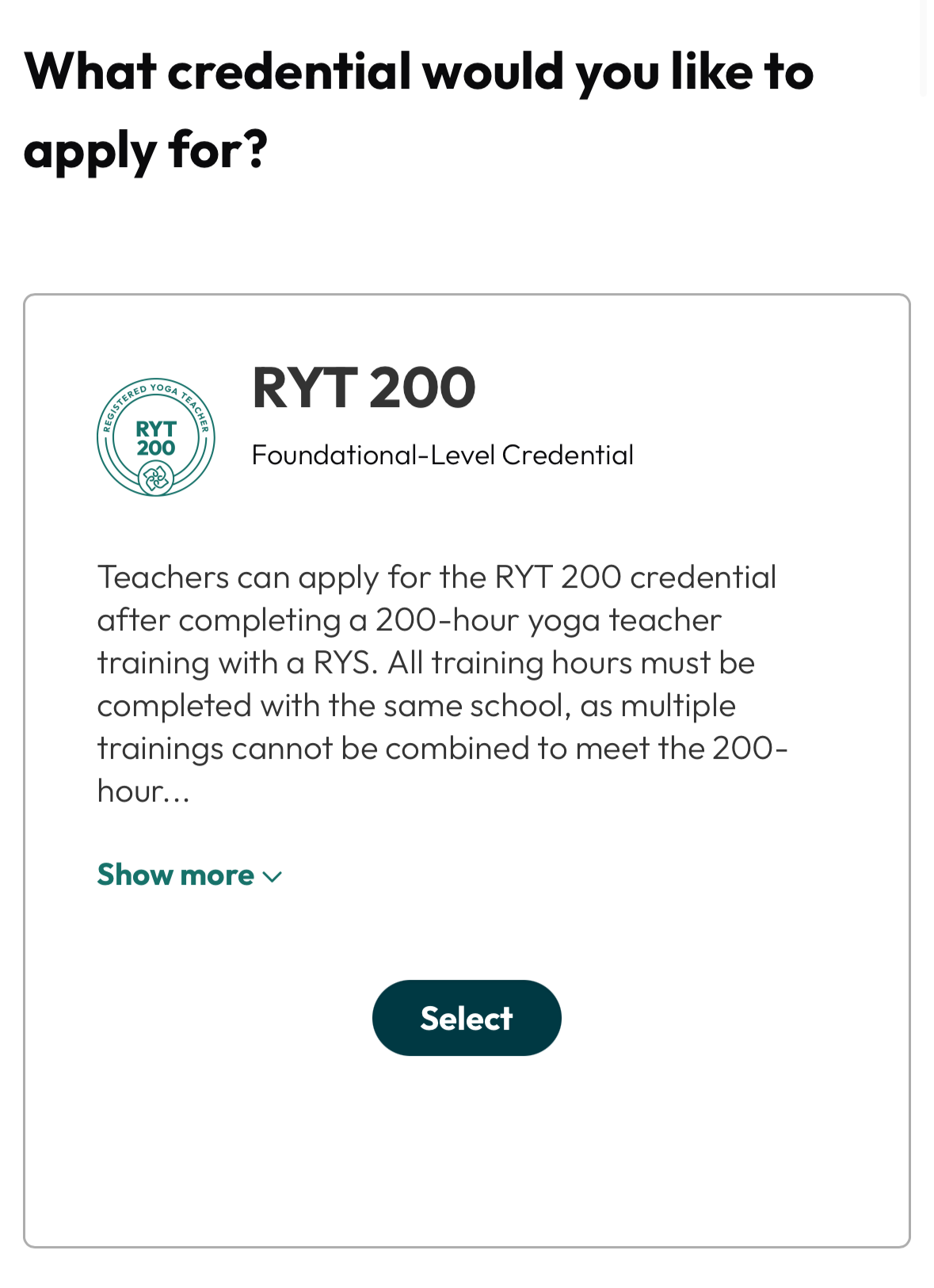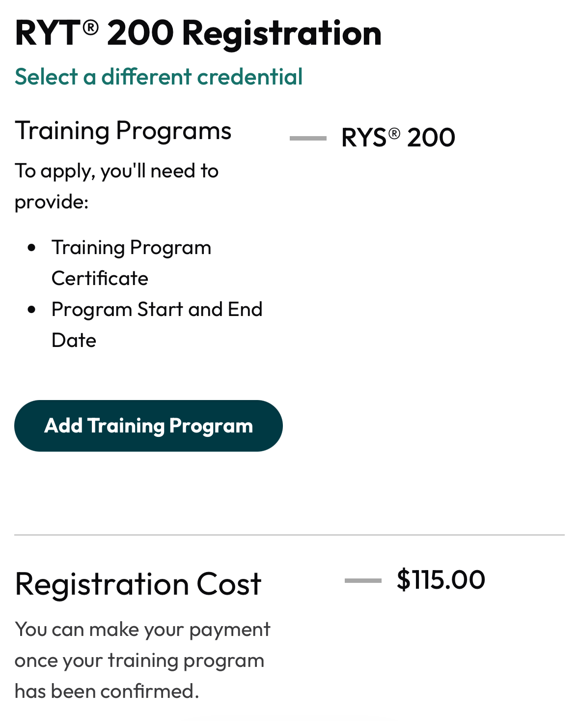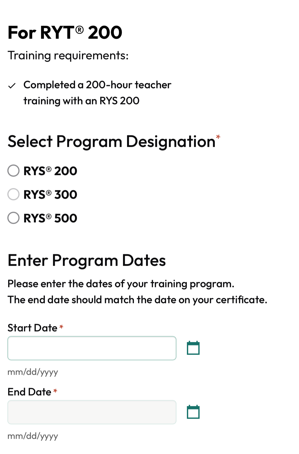 Seleziona RYS 200 (se hai completato una formazione di 200 ore)