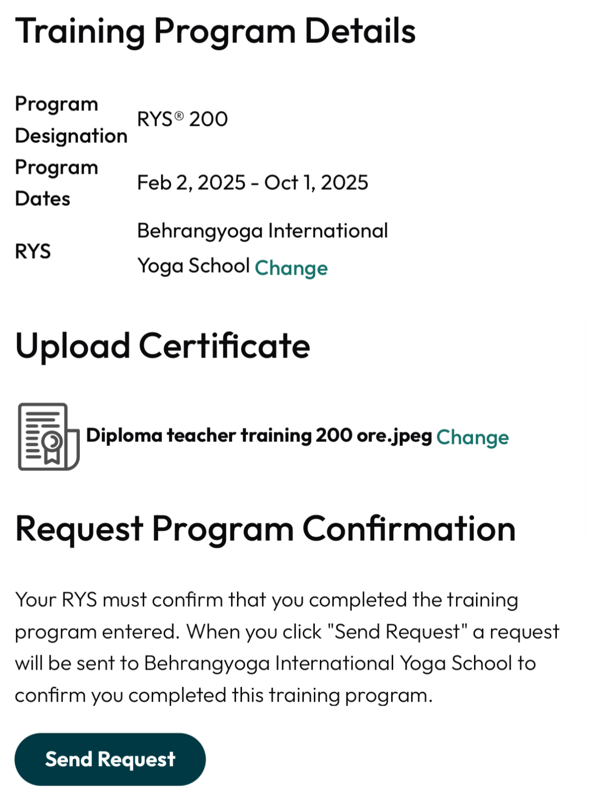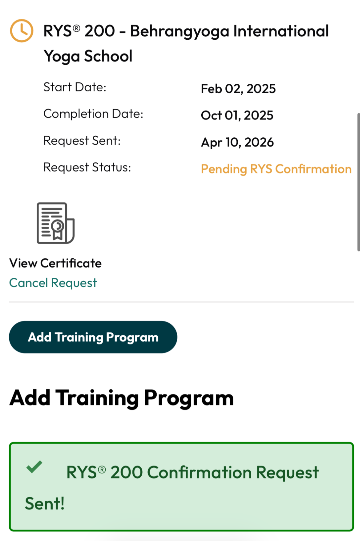 Yoga Alliance invierà automaticamente una richiesta alla tua scuola (Behrangyoga International Yoga School) per confermare che hai completato il percorso.
